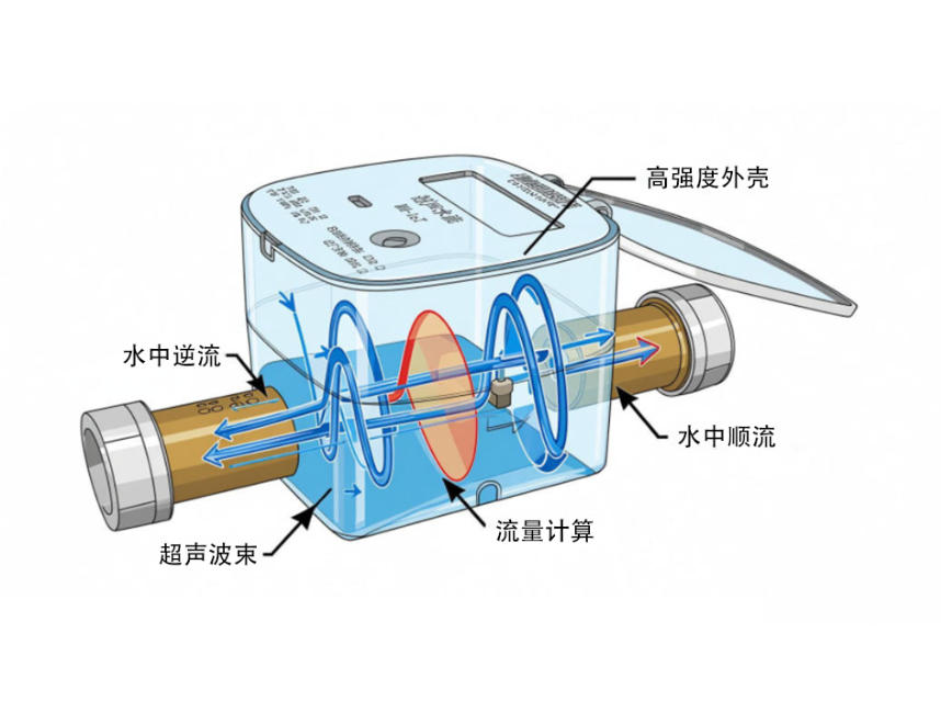 超聲波水表的核心技術原理是“時差法” ,即通過測量超聲波束在水中順流和逆流傳播的時間差來確定水流速度。